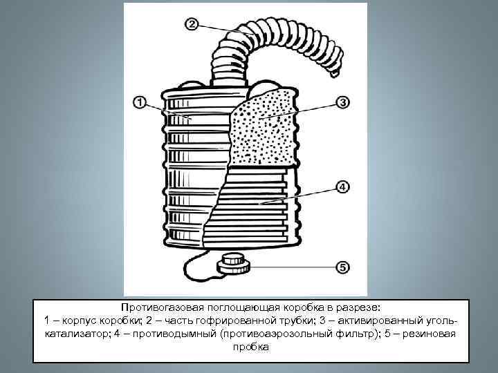 Противогазовая поглощающая коробка в разрезе: 1 – корпус коробки; 2 – часть гофрированной трубки; 3 – активированный уголь- катализатор; 4 – противодымный (противоаэрозольный фильтр); 5 – резиновая пробка