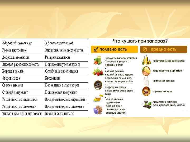 n n n Осложнения запоров Длительно существующий запор может вызывать различные осложнения. Могут возникнуть вторичный колит, проктосигмоидит (воспаление сигмовидной и прямой кишки). При длительном застое содержимого в слепой кишке возможно обратное его забрасывание в тонкую кишку с развитием энтерита (рефлюкс-энтерит). Запоры могут осложняться заболеваниями желчевыводящих путей, гепатитом. Длительные запоры способствуют появлению различных болезней прямой кишки. Чаще всего возникает геморрой. При запорах могут возникнуть также трещина заднего прохода, воспаление околопрямокишечной клетчатки (парапроктит). Длительные запоры иногда становятся причиной расширения и удлинения толстой кишки (приобретённый мегаколон), что делает запоры ещё более упорными. Наиболее грозным осложнением длительных запоров является рак прямой и толстой кишки. Существует мнение, что застой содержимого в кишечнике, вызванный употреблением продуктов, бедных пищевыми волокнами, приводит к большой концентрации образующихся в кишечнике канцерогенных (способствующих развитию рака) веществ и длительному их действию на стенку кишки. Тревожными симптомами, позволяющими заподозрить возможность возникновения опухоли толстой кишки, являются общее плохое самочувствие, похудение, недавнее появление запора у людей старше 50 лет, стул у которых до того был нормальный, кровь в кале.