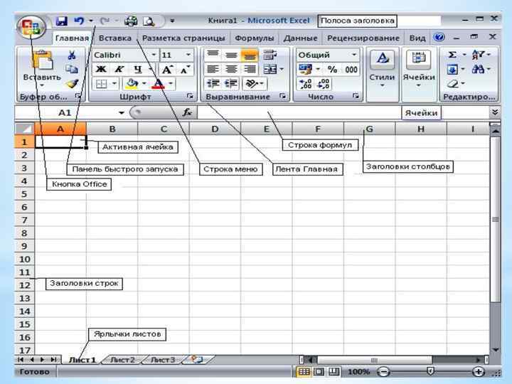 На следующем рисунке показано типовое окно Excel. Верхняя строка окна приложения Excel называется полосой заголовка. В ней указывается имя программы Microsoft Excel и название рабочей книги Книга 1 (либо открытого файла).