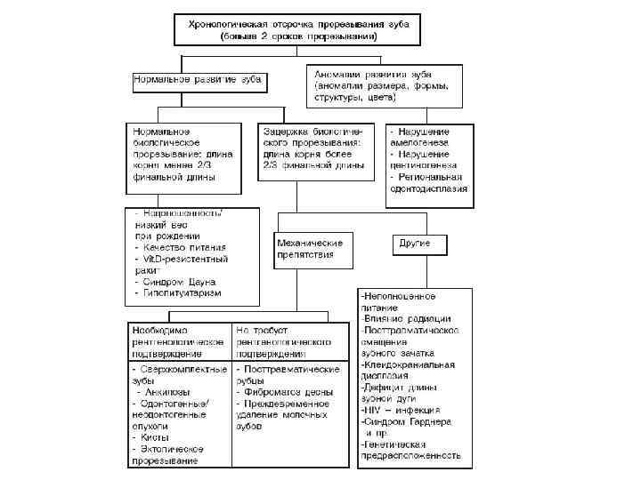 Аномалии развития и прорезывания зубов, изменения их цвета ФАКТОРЫ Факторы местного характера: 1. интоксикация и инфицирование зачатка постоянного зуба от молочного зуба; Обменные факторы и инфекция: 2. задержка молочного зуба; эндокринные нарушения связанные с деятельностью 3. сращение задержанного зуба с корнем соседнего Филогенетические факторы – уменьшение размеров челюстей щитовидной и паращитовидной желёз, рахит, авитаминозы, сифилис. прорезывающегося зуба; по сравнению с величиной и телом зубов В результате развивается диспропорция темпа ростазубов. и челюстей. 4. ранняя потеря молочного зуба – рубцы и конвергенция коронок соседних зубов; 5. патологические разрастания на корнях (цементомы); 6. глубокая закладка фолликула в толще челюсти; 7. образование фолликулярных кист; 8. оттеснение зубного зачатка опухолью (одонтома, остеома, адамантинома, киста и др. ).