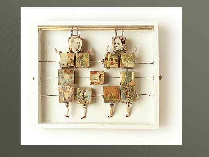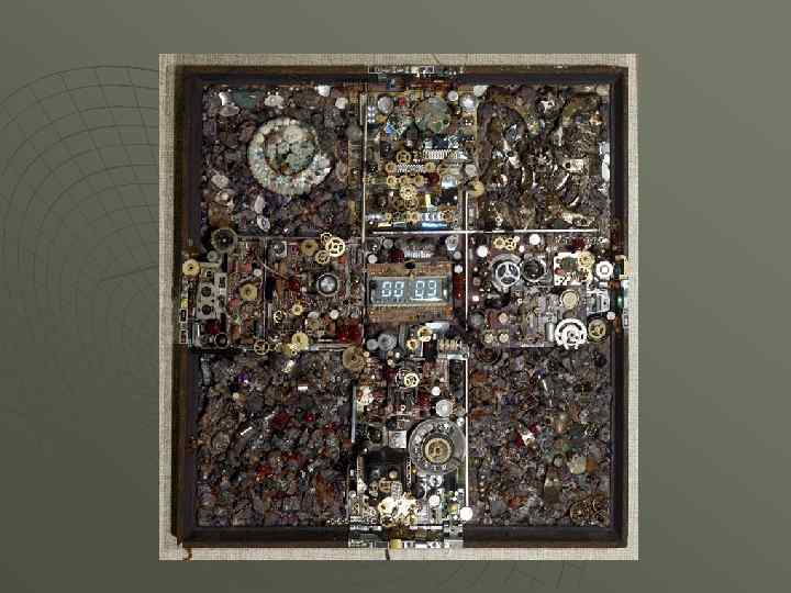 Ассамбляж u Ассамбляж был блестяще использован русскими художниками в начале XX века — Татлиным, Пуни, Родченко, — однако термин ввёл Жан Дюбюффе в 1953 г. для обозначения произведений искусства, выполненных из обломков естественных материалов, предметов или их фрагментов — например, из утиля. В широкий обиход термин вошел после выставки «Искусство ассамбляжа» , проходившей в нью-йоркском Музее современного искусства в 1961 г. , в частности, впервые широко представившей сюрреалистские ассамбляжи Джозефа Корнелла. Одним из основателей техники считается французский художник Сезар (картина «Мусорная корзина золотого голубя» , 1969), особенностью творчества которого являлось прессование материала для своих произведений.
