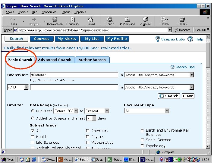 SCOPUS - новая политематическая реферативная БД с системой цитирования Объединяет все тематичексие БД Elsevier, в т. ч. : - Compendex (физ. -мат. и техн. науки) - Geo. Base (науки о Земле) - Embase (медицина, фармакология) - Bio. Sis (науки о жизни) и др. - Medline (не принадлежит Elsevier) Одновременно идет поиск по Интернет через Scirus