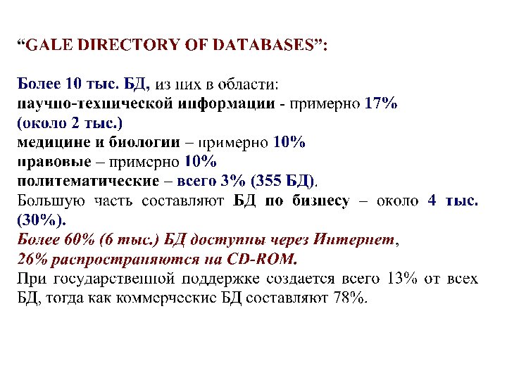 Основные характеристики, интересующие пользователя при выборе БД • Количественные характеристики БД: - объем БД; число источников, число документов, хронологические рамки; • Качественные параметры обрабатываемых источников (тематический охват; виды документов, представительность источников (оценочные показатели (импакт-фактор), язык, страны и др. ) • Поисковые возможности (виды запросов, возможности итерации, показатели полноты, точности, подключение дополнительных лингвистических средств - словари, тезаурусы); • «Удобства» интерфейса (простота, дружественность); • Возможности и разнообразие получения и сохранения результатов поиска (форматы вывода, варианты сохранения и выгрузки и др. ); • другие дополнительные возможности (ведение личных папок, индивидуальное информирование и др. ).
