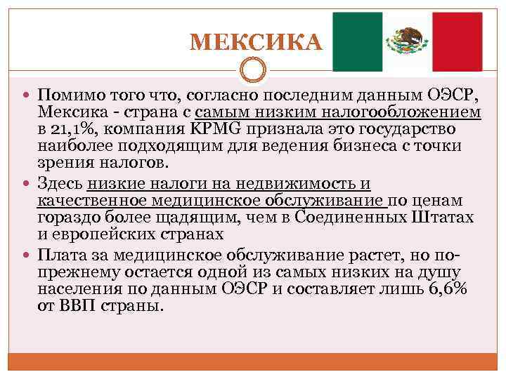 МЕКСИКА Помимо того что, согласно последним данным ОЭСР, Мексика - страна с самым низким налогообложением в 21, 1%, компания KPMG признала это государство наиболее подходящим для ведения бизнеса с точки зрения налогов. Здесь низкие налоги на недвижимость и качественное медицинское обслуживание по ценам гораздо более щадящим, чем в Соединенных Штатах и европейских странах Плата за медицинское обслуживание растет, но попрежнему остается одной из самых низких на душу населения по данным ОЭСР и составляет лишь 6, 6% от ВВП страны.