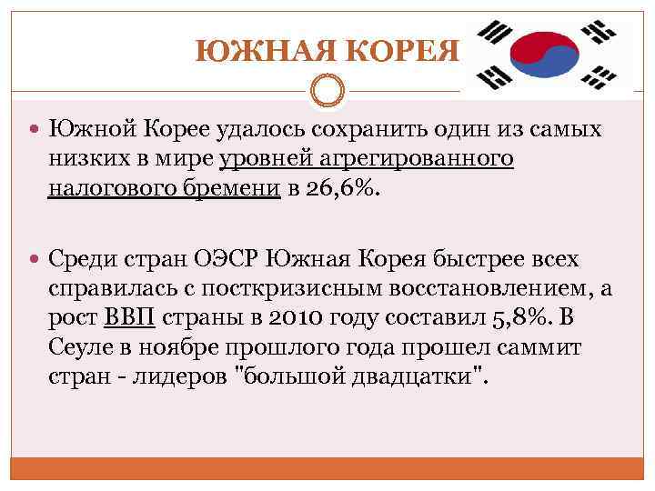 ЮЖНАЯ КОРЕЯ Южной Корее удалось сохранить один из самых низких в мире уровней агрегированного налогового бремени в 26, 6%. Среди стран ОЭСР Южная Корея быстрее всех справилась с посткризисным восстановлением, а рост ВВП страны в 2010 году составил 5, 8%. В Сеуле в ноябре прошлого года прошел саммит стран - лидеров "большой двадцатки".