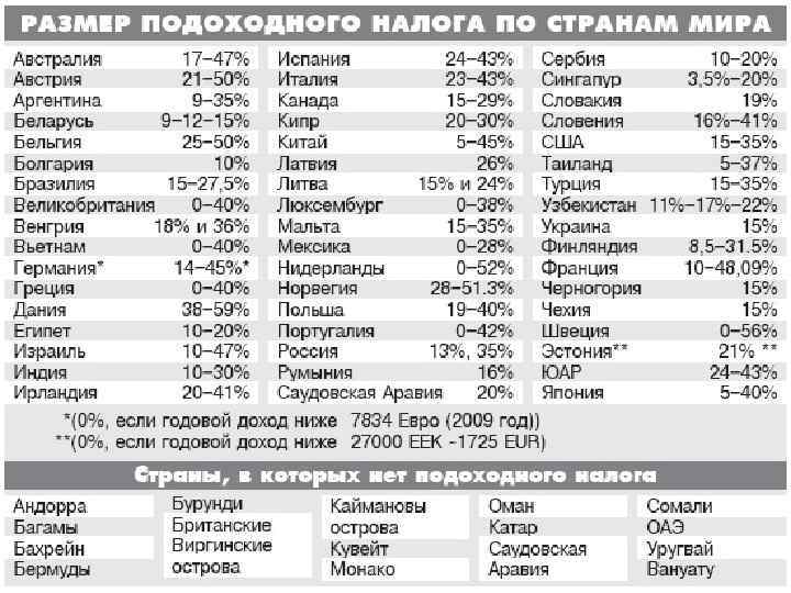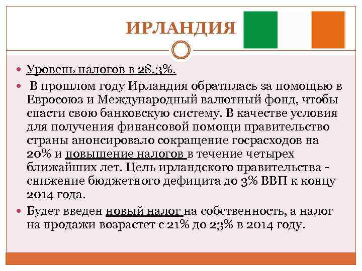 ИРЛАНДИЯ Уровень налогов в 28, 3%. В прошлом году Ирландия обратилась за помощью в Евросоюз и Международный валютный фонд, чтобы спасти свою банковскую систему. В качестве условия для получения финансовой помощи правительство страны анонсировало сокращение госрасходов на 20% и повышение налогов в течение четырех ближайших лет. Цель ирландского правительства снижение бюджетного дефицита до 3% ВВП к концу 2014 года. Будет введен новый налог на собственность, а налог на продажи возрастет с 21% до 23% в 2014 году.