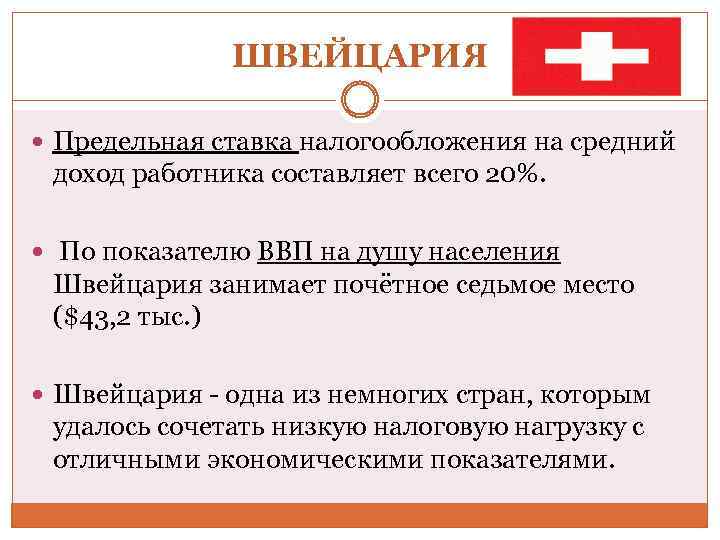 ШВЕЙЦАРИЯ Предельная ставка налогообложения на средний доход работника составляет всего 20%. По показателю ВВП на душу населения Швейцария занимает почётное седьмое место ($43, 2 тыс. ) Швейцария - одна из немногих стран, которым удалось сочетать низкую налоговую нагрузку с отличными экономическими показателями.