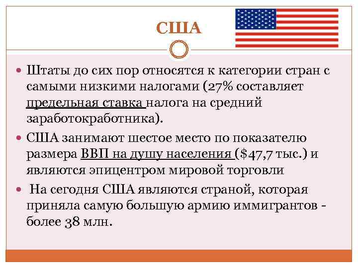 США Штаты до сих пор относятся к категории стран с самыми низкими налогами (27% составляет предельная ставка налога на средний заработокработника). США занимают шестое место по показателю размера ВВП на душу населения ($47, 7 тыс. ) и являются эпицентром мировой торговли На сегодня США являются страной, которая приняла самую большую армию иммигрантов более 38 млн.