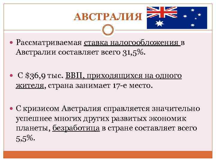 АВСТРАЛИЯ Рассматриваемая ставка налогообложения в Австралии составляет всего 31, 5%. С $36, 9 тыс. ВВП, приходящихся на одного жителя, страна занимает 17 -е место. С кризисом Австралия справляется значительно успешнее многих других развитых экономик планеты, безработица в стране составляет всего 5, 5%.