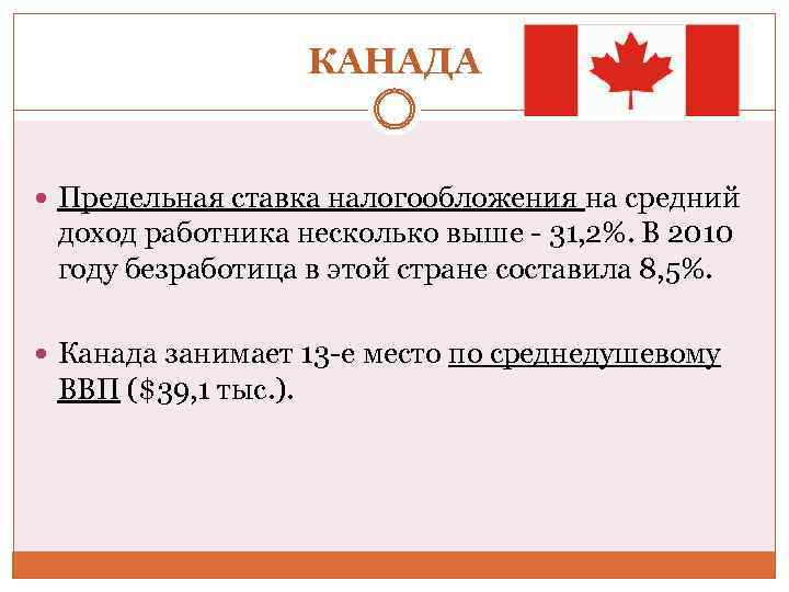 КАНАДА Предельная ставка налогообложения на средний доход работника несколько выше - 31, 2%. В 2010 году безработица в этой стране составила 8, 5%. Канада занимает 13 -е место по среднедушевому ВВП ($39, 1 тыс. ).