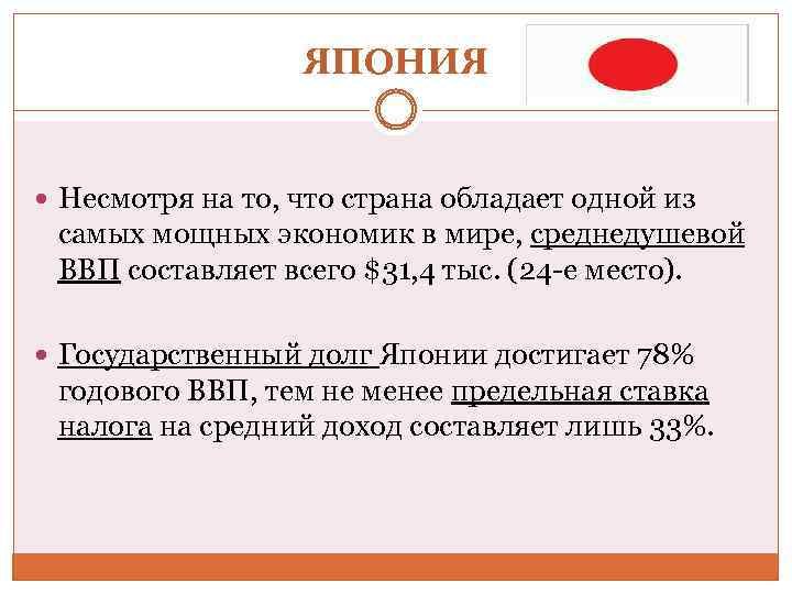 ЯПОНИЯ Несмотря на то, что страна обладает одной из самых мощных экономик в мире, среднедушевой ВВП составляет всего $31, 4 тыс. (24 -е место). Государственный долг Японии достигает 78% годового ВВП, тем не менее предельная ставка налога на средний доход составляет лишь 33%.