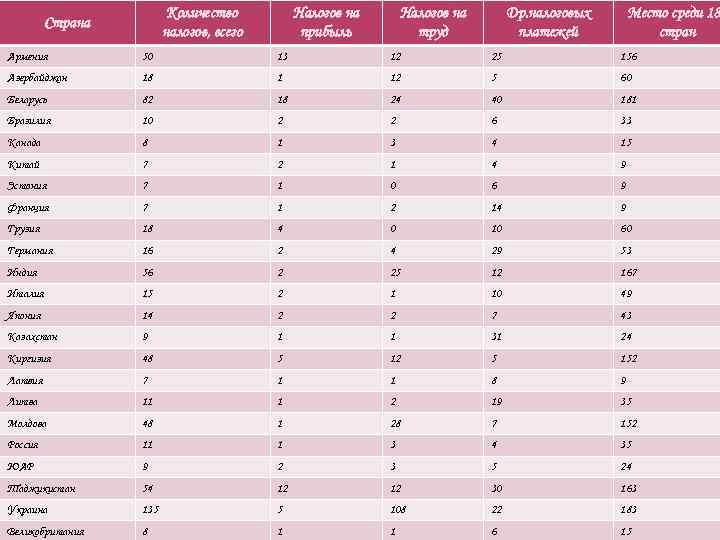 Количество налогов, всего Страна Налогов на прибыль Налогов на труд Др. налоговых платежей Место среди 18 стран Армения 50 13 12 25 156 Азербайджан 18 1 12 5 60 Беларусь 82 18 24 40 181 Бразилия 10 2 2 6 33 Канада 8 1 3 4 15 Китай 7 2 1 4 9 Эстония 7 1 0 6 9 Франция 7 1 2 14 9 Грузия 18 4 0 10 60 Германия 16 2 4 29 53 Индия 56 2 25 12 167 Италия 15 2 1 10 49 Япония 14 2 2 7 43 Казахстан 9 1 1 31 24 Киргизия 48 5 12 5 152 Латвия 7 1 1 8 9 Литва 11 1 2 19 35 Молдова 48 1 28 7 152 Россия 11 1 3 4 35 ЮАР 9 2 3 5 24 Таджикистан 54 12 12 30 163 Украина 135 5 108 22 183 Великобритания 8 1 1 6 15