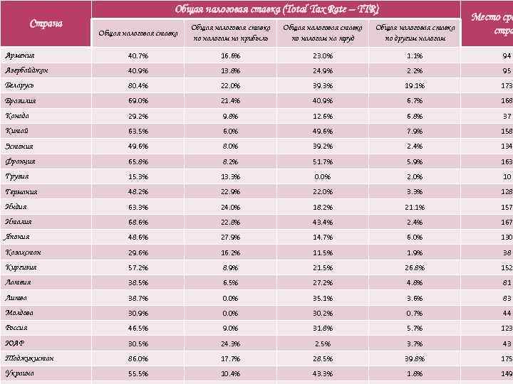 Общая налоговая ставка (Total Tax Rate – TTR) Страна Место сре стра Общая налоговая ставка по налогам на прибыль Общая налоговая ставка по налогам на труд Общая налоговая ставка по другим налогам Армения 40. 7% 16. 6% 23. 0% 1. 1% 94 Азербайджан 40. 9% 13. 8% 24. 9% 2. 2% 95 Беларусь 80. 4% 22. 0% 39. 3% 19. 1% 173 Бразилия 69. 0% 21. 4% 40. 9% 6. 7% 168 Канада 29. 2% 9. 8% 12. 6% 6. 8% 37 Китай 63. 5% 6. 0% 49. 6% 7. 9% 158 Эстония 49. 6% 8. 0% 39. 2% 2. 4% 134 Франция 65. 8% 8. 2% 51. 7% 5. 9% 163 Грузия 15. 3% 13. 3% 0. 0% 2. 0% 10 Германия 48. 2% 22. 9% 22. 0% 3. 3% 128 Индия 63. 3% 24. 0% 18. 2% 21. 1% 157 Италия 68. 6% 22. 8% 43. 4% 2. 4% 167 Япония 48. 6% 27. 9% 14. 7% 6. 0% 130 Казахстан 29. 6% 16. 2% 11. 5% 1. 9% 38 Киргизия 57. 2% 8. 9% 21. 5% 26. 8% 152 Латвия 38. 5% 6. 5% 27. 2% 4. 8% 81 Литва 38. 7% 0. 0% 35. 1% 3. 6% 83 Молдова 30. 9% 0. 0% 30. 2% 0. 7% 44 Россия 46. 5% 9. 0% 31. 8% 5. 7% 123 ЮАР 30. 5% 24. 3% 2. 5% 3. 7% 43 Таджикистан 86. 0% 17. 7% 28. 5% 39. 8% 175 Украина 55. 5% 10. 4% 43. 3% 1. 8% 149