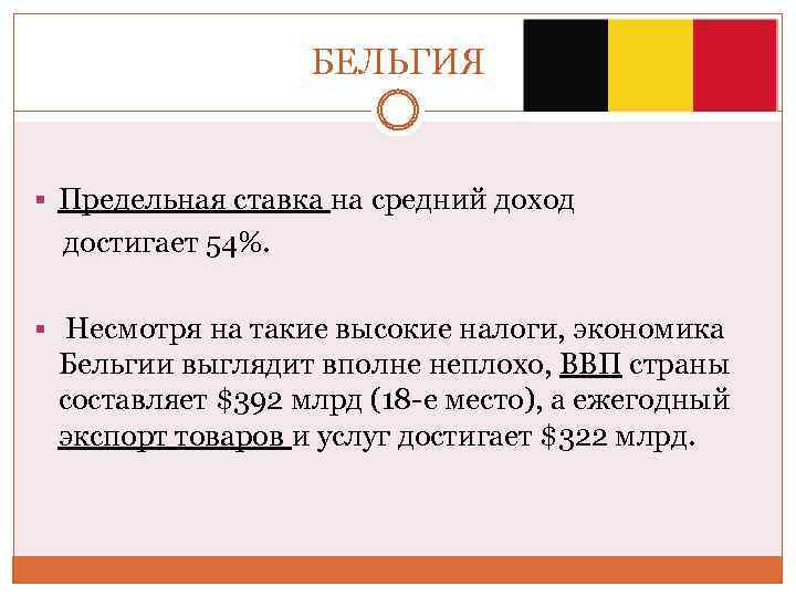 БЕЛЬГИЯ § Предельная ставка на средний доход достигает 54%. § Несмотря на такие высокие налоги, экономика Бельгии выглядит вполне неплохо, ВВП страны составляет $392 млрд (18 -е место), а ежегодный экспорт товаров и услуг достигает $322 млрд.