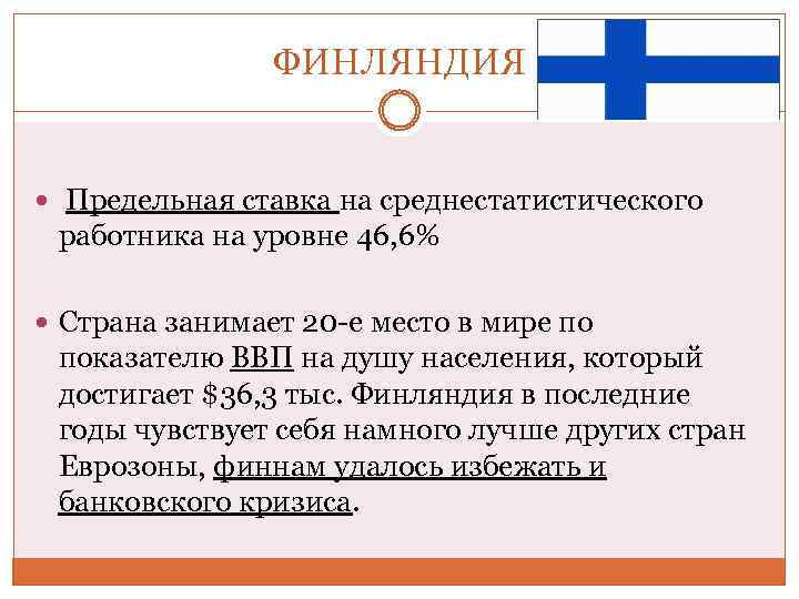 ФИНЛЯНДИЯ Предельная ставка на среднестатистического работника на уровне 46, 6% Страна занимает 20 -е место в мире по показателю ВВП на душу населения, который достигает $36, 3 тыс. Финляндия в последние годы чувствует себя намного лучше других стран Еврозоны, финнам удалось избежать и банковского кризиса.