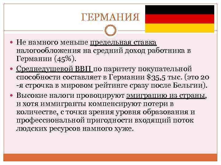 ГЕРМАНИЯ Не намного меньше предельная ставка налогообложения на средний доход работника в Германии (45%). Среднедушевой ВВП по паритету покупательной способности составляет в Германии $35, 5 тыс. (это 20 -я строчка в мировом рейтинге сразу после Бельгии). Высокие налоги провоцируют эмиграцию из страны, и хотя иммигранты компенсируют потери в количестве, с точки зрения уровня образования и профессиональной пригодности входящий поток людских ресурсов намного хуже.