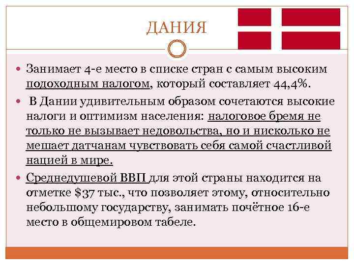 ДАНИЯ Занимает 4 -е место в списке стран с самым высоким подоходным налогом, который составляет 44, 4%. В Дании удивительным образом сочетаются высокие налоги и оптимизм населения: налоговое бремя не только не вызывает недовольства, но и нисколько не мешает датчанам чувствовать себя самой счастливой нацией в мире. Среднедушевой ВВП для этой страны находится на отметке $37 тыс. , что позволяет этому, относительно небольшому государству, занимать почётное 16 -е место в общемировом табеле.