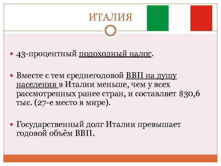ИТАЛИЯ 43 -процентный подоходный налог. Вместе с тем среднегодовой ВВП на душу населения в Италии меньше, чем у всех рассмотренных ранее стран, и составляет $30, 6 тыс. (27 -е место в мире). Государственный долг Италии превышает годовой объём ВВП.