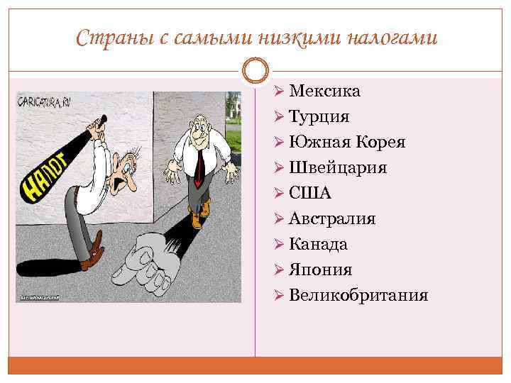 Страны с самыми низкими налогами Ø Мексика Ø Турция Ø Южная Корея Ø Швейцария Ø США Ø Австралия Ø Канада Ø Япония Ø Великобритания