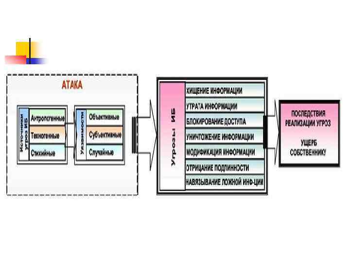 Причины случайных воздействий: n n n n Отказы и сбои аппаратуры; Помехи на линиях связи от воздействия внешней среды; Ошибки человека как звена информационной системы; Схемные и схемотехнические ошибки разработчиков аппаратуры, входящей в состав информационной системы; Структурные, алгоритмические и программные ошибки; Аварийные ситуации; Другие воздействия.
