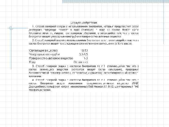 Объект изобретения - вещество Для характеристики вещества используют следующие признаки. Для индивидуальных химических соединений это: - качественный и количественный состав вещества; - связь между атомами и структурная формула. Для композиций это: - качественный состав ингредиентов; - количественный состав ингредиентов; - структура композиции и ингредиентов. Объект изобретения – применение Для характеристики применения известных ранее устройства, способа или вещества по новому назначению используются краткая характеристика применяемого объекта, достаточная для его идентификации и указание этого нового назначения.