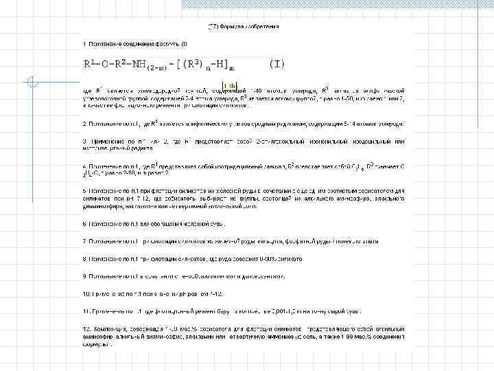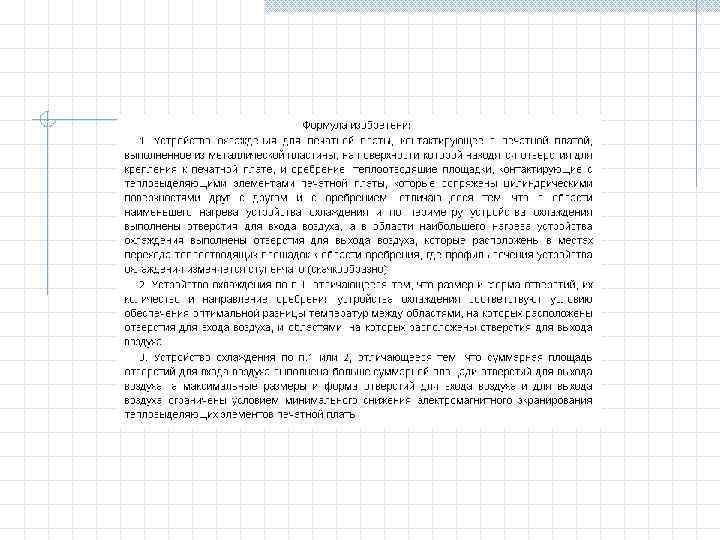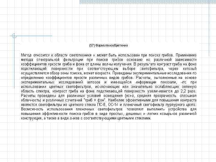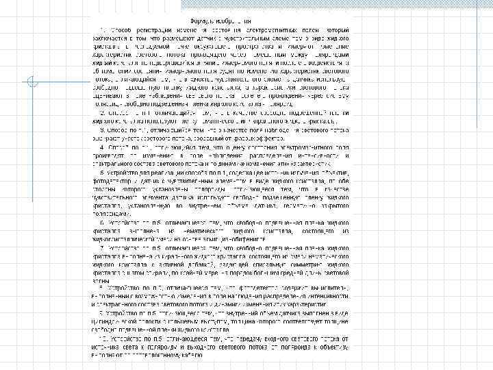 Особенности формулы изобретения 1. Формула может быть однозвенной, то есть изложенной в виде одного пункта, либо многозвенной, т. е. изложенной в виде нескольких пунктов. 2. Однозвенная формула применяется тогда, когда существенные признаки объекта исчерпывают его основную техническую характеристику. 3. Многозвенная формула применяется при необходимости развить или уточнить указанную в первом пункте формулы совокупность признаков. В многозвенной формуле самостоятельное правовое значение имеет только первый пункт формулы. 4. При создании группы изобретений, связанных между собой единым творческим замыслом выраженном в виде единой цели изобретения, допускается объединение их в одну заявку. Формула составляется в виде отдельных независимых пунктов формулы изобретения без указания ссылки на какие либо другие пункты (например, способ и устройство для его осуществления). Правовое значение формулы изобретения заключается в том, что она является единственным критерием для определения объема изобретения и по ней устанавливается факт использования (или не использования изобретения).