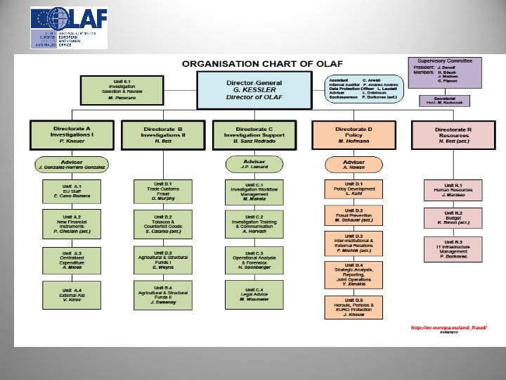 ИСТОРИЯ НА ИНСТИТУЦИЯТА 1988 – създаването на предшественика UCLAF 1999, 1 Юни – създаване на ОЛАФ 1999, 1 Август – първи Надзорен Комитет 2000 -2010 – мандат на F. H. Brüner, първи генерален директор 2011 – мандат на G. Kessler, генерален директор 2012 – обща реорганизация на ОЛАФ "OLAF" е френският акроним на Службата – Office Européen dе Lutte Anti-Fraude.