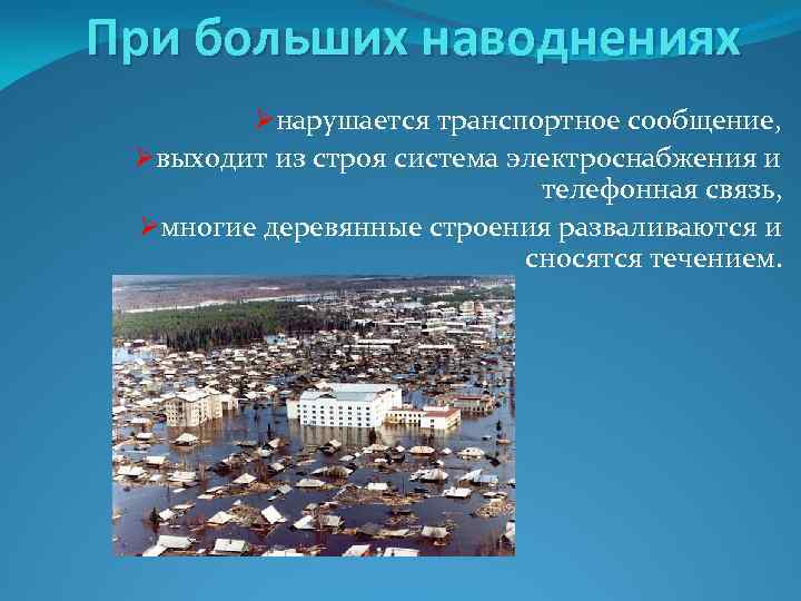 При больших наводнениях Øнарушается транспортное сообщение, Øвыходит из строя система электроснабжения и телефонная связь, Øмногие деревянные строения разваливаются и сносятся течением.
