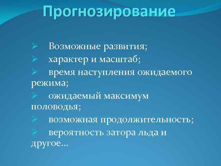 Прогнозирование Ø Возможные развития; Ø характер и масштаб; Ø время наступления ожидаемого режима; Ø ожидаемый максимум половодья; Ø возможная продолжительность; Ø вероятность затора льда и другое…