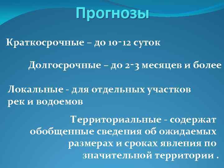 Прогнозы Краткосрочные – до 10‑ 12 суток Долгосрочные – до 2‑ 3 месяцев и более Локальные - для отдельных участков рек и водоемов Территориальные - содержат обобщенные сведения об ожидаемых размерах и сроках явления по значительной территории.