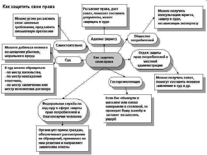 Защита прав потребителей комплекс мер, - реализуемых государством и общественными движениями, направленных на регулирование отношений, возникающих между потребителем и субъектом предпринимательской деятельности — изготовителем, исполнителем, продавцом и включающих в себя: установление конкретных прав потребителей; формы возможных нарушений прав и механизм их защиты; ответственность за нарушение прав потребителей.