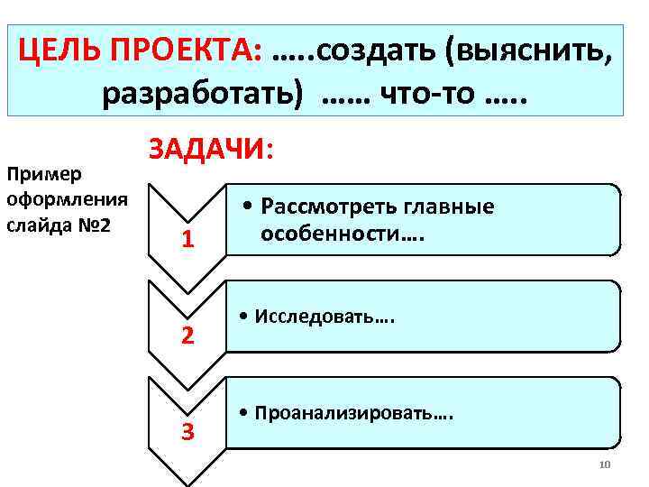 ЦЕЛЬ ПРОЕКТА: …. . создать (выяснить, разработать) …… что-то …. . Пример оформления слайда № 2 ЗАДАЧИ: 1 2 3 • Рассмотреть главные особенности…. • Исследовать…. • Проанализировать…. 10