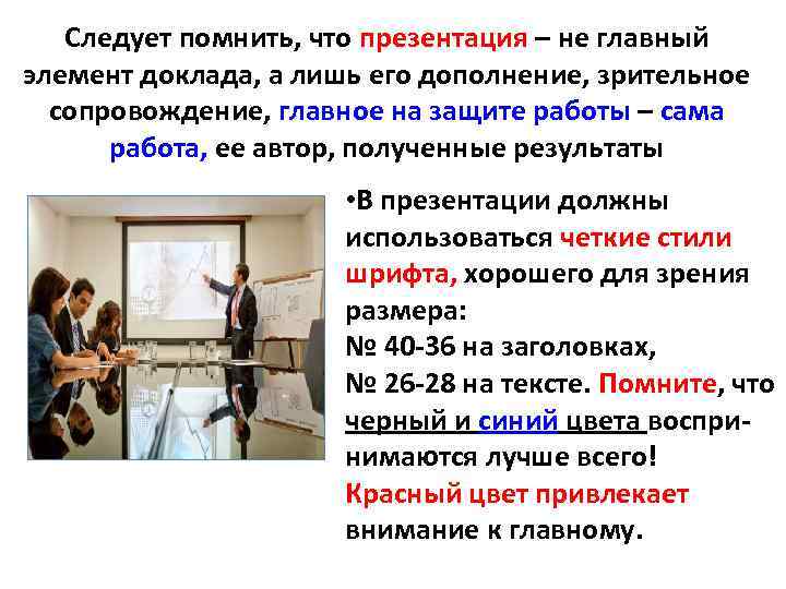 Следует помнить, что презентация – не главный элемент доклада, а лишь его дополнение, зрительное сопровождение, главное на защите работы – сама работа, ее автор, полученные результаты • В презентации должны использоваться четкие стили шрифта, хорошего для зрения размера: № 40 -36 на заголовках, № 26 -28 на тексте. Помните, что черный и синий цвета воспринимаются лучше всего! Красный цвет привлекает внимание к главному.