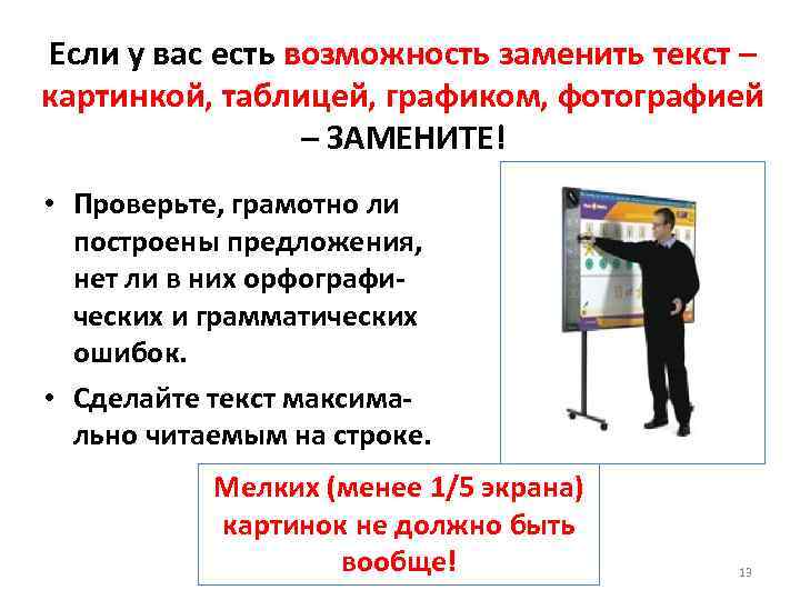 Если у вас есть возможность заменить текст – картинкой, таблицей, графиком, фотографией – ЗАМЕНИТЕ! • Проверьте, грамотно ли построены предложения, нет ли в них орфографических и грамматических ошибок. • Сделайте текст максимально читаемым на строке. Мелких (менее 1/5 экрана) картинок не должно быть вообще! 13