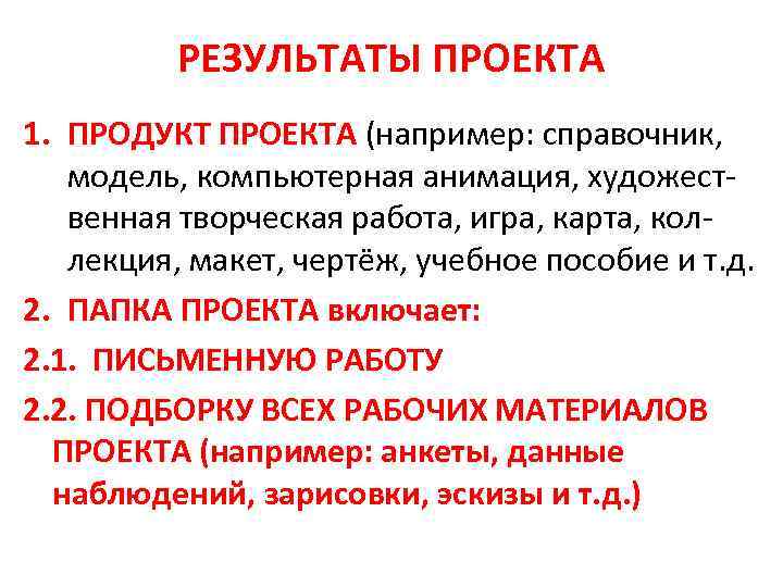 РЕЗУЛЬТАТЫ ПРОЕКТА 1. ПРОДУКТ ПРОЕКТА (например: справочник, модель, компьютерная анимация, художественная творческая работа, игра, карта, коллекция, макет, чертёж, учебное пособие и т. д. 2. ПАПКА ПРОЕКТА включает: 2. 1. ПИСЬМЕННУЮ РАБОТУ 2. 2. ПОДБОРКУ ВСЕХ РАБОЧИХ МАТЕРИАЛОВ ПРОЕКТА (например: анкеты, данные наблюдений, зарисовки, эскизы и т. д. )