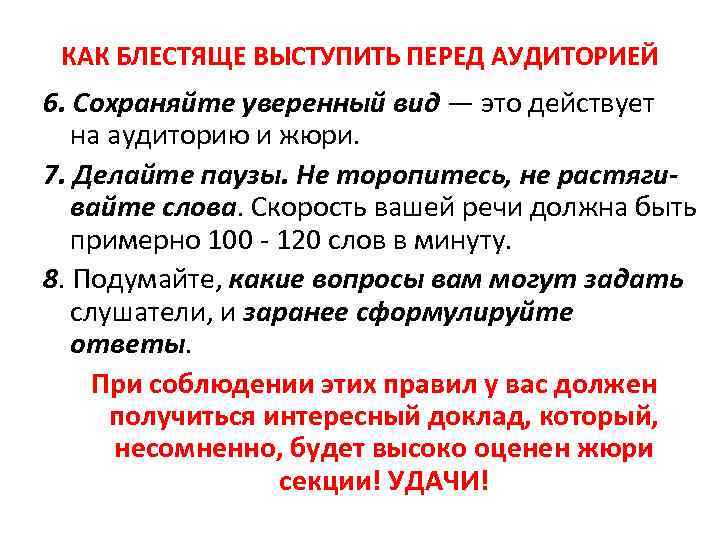 КАК БЛЕСТЯЩЕ ВЫСТУПИТЬ ПЕРЕД АУДИТОРИЕЙ 6. Сохраняйте уверенный вид — это действует на аудиторию и жюри. 7. Делайте паузы. Не торопитесь, не растягивайте слова. Скорость вашей речи должна быть примерно 100 - 120 слов в минуту. 8. Подумайте, какие вопросы вам могут задать слушатели, и заранее сформулируйте ответы. При соблюдении этих правил у вас должен получиться интересный доклад, который, несомненно, будет высоко оценен жюри секции! УДАЧИ!