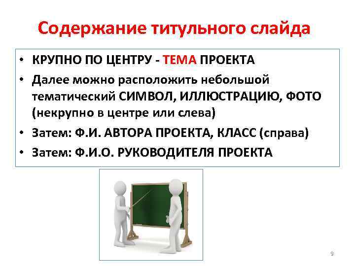 Содержание титульного слайда • КРУПНО ПО ЦЕНТРУ - ТЕМА ПРОЕКТА • Далее можно расположить небольшой тематический СИМВОЛ, ИЛЛЮСТРАЦИЮ, ФОТО (некрупно в центре или слева) • Затем: Ф. И. АВТОРА ПРОЕКТА, КЛАСС (справа) • Затем: Ф. И. О. РУКОВОДИТЕЛЯ ПРОЕКТА 9