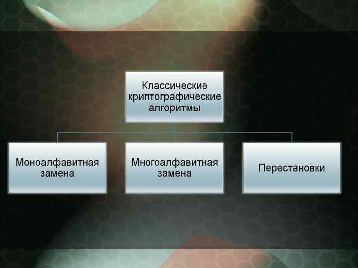 ШИФР Цезаря Историческим примером шифра замены является шифр Цезаря (I век до н. э. ), описанный историком Древнего Рима Светонием. Применительно к современному кириллическому алфавиту он состоял в следующем. Выписывался алфавит: А, Б, В, Г, Д, Е, . . . ; затем под ним выписывался тот же алфавит, но с циклическим сдвигом на 3 буквы влево: АБВГДЕЁЖЗИЙКЛМНОПРСТУФХЦЧШЩЫЪЬЭЮЯ Г Д Е Ё Ж З И Й К Л М НО П Р С Т У Ф Х Ц ЧШ Щ ЫЪ Ь Э Ю Я А Б В При зашифровании буква А заменялась буквой Г, Б заменялась на Д, В – Е и так далее. Так, например, слово «РИМ» превращалось в слово «УЛП» . Получатель сообщения «УЛП» искал эти буквы в нижней строке и по буквам над ними восстанавливал исходное слово «РИМ» . Ключом в шифре Цезаря является величина сдвига 2 -й нижней строки алфавита.