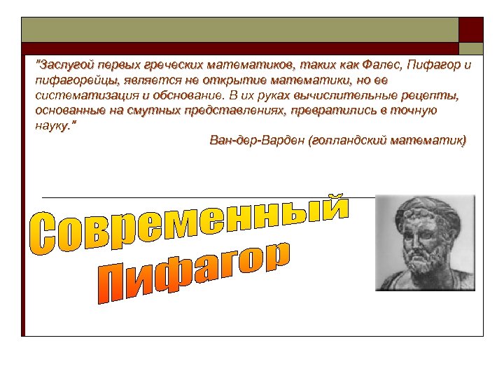 "Заслугой первых греческих математиков, таких как Фалес, Пифагор и пифагорейцы, является не открытие математики, но ее систематизация и обснование. В их руках вычислительные рецепты, основанные на смутных представлениях, превратились в точную науку. " Ван-дер-Варден (голландский математик)