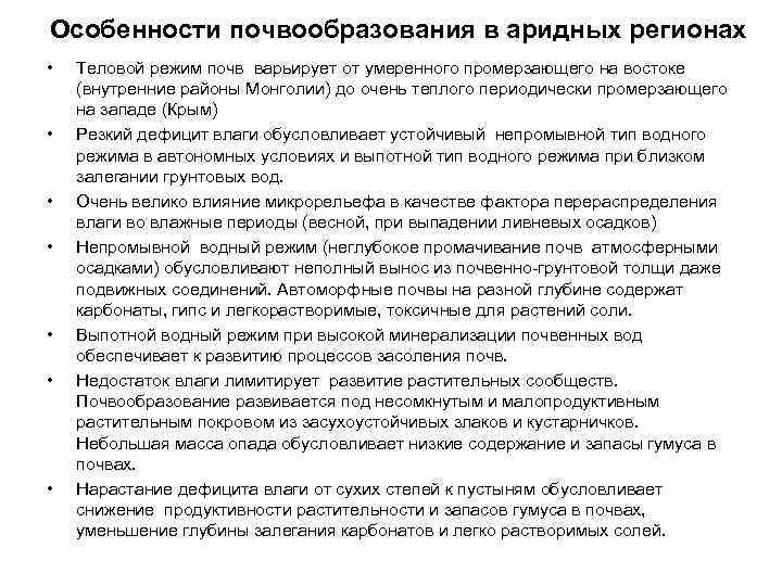 Особенности почвообразования в аридных регионах • Теловой режим почв варьирует от умеренного промерзающего на востоке (внутренние районы Монголии) до очень теплого периодически промерзающего на западе (Крым) • Резкий дефицит влаги обусловливает устойчивый непромывной тип водного режима в автономных условиях и выпотной тип водного режима при близком залегании грунтовых вод. • Очень велико влияние микрорельефа в качестве фактора перераспределения влаги во влажные периоды (весной, при выпадении ливневых осадков) • Непромывной водный режим (неглубокое промачивание почв атмосферными осадками) обусловливают неполный вынос из почвенно-грунтовой толщи даже подвижных соединений. Автоморфные почвы на разной глубине содержат карбонаты, гипс и легкорастворимые, токсичные для растений соли. • Выпотной водный режим при высокой минерализации почвенных вод обеспечивает к развитию процессов засоления почв. • Недостаток влаги лимитирует развитие растительных сообществ. Почвообразование развивается под несомкнутым и малопродуктивным растительным покровом из засухоустойчивых злаков и кустарничков. Небольшая масса опада обусловливает низкие содержание и запасы гумуса в почвах. • Нарастание дефицита влаги от сухих степей к пустыням обусловливает снижение продуктивности растительности и запасов гумуса в почвах, уменьшение глубины залегания карбонатов и легко растворимых солей.