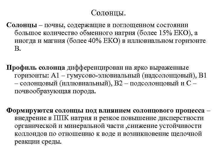 Солонцы – почвы, содержащие в поглощенном состоянии большое количество обменного натрия (более 15% ЕКО), а иногда и магния (более 40% ЕКО) в иллювиальном горизонте В. Профиль солонца дифференцирован на ярко выраженные горизонты: А 1 – гумусово-элювиальный (надсолонцовый), В 1 – солонцовый (иллювиальный), В 2 – подсолонцовый и С – почвообразующая порода. Формируются солонцы под влиянием солонцового процесса – внедрение в ППК натрия и резкое повышение дисперстности органической и минеральной части , снижение устойчивости коллоидов по отношению к воде и возникновение щелочной реакции среды.