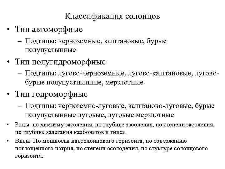 Классификация солонцов • Тип автоморфные – Подтипы: черноземные, каштановые, бурые полупустынные • Тип полугидроморфные – Подтипы: лугово-черноземные, лугово-каштановые, лугово- бурые полупустнынные, мерзлотные • Тип годроморфные – Подтипы: черноземно-луговые, каштаново-луговые, бурые полупустынные луговые, луговые мерзлотные • Роды: по химизму засоления, по глубине засоления, по степени засоления, по глубине залегания карбонатов и гипса. • Виды: По мощности надсолонцового горизонта, по содержанию поглощенного натрия, по степени осолодения, по стуктуре солонцового горизонта.