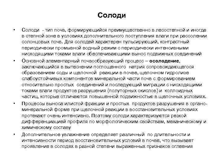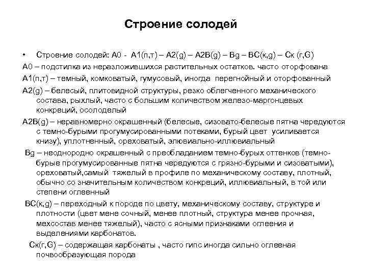 Строение солодей • Строение солодей: А 0 - А 1(п, т) – А 2(g) – А 2 В(g) – Вg – ВС(к, g) – Ск (г, G) А 0 – подстилка из неразложившихся растительных остатков. часто оторфована А 1(п, т) – темный, комковатый, гумусовый, иногда перегнойный и оторфованный А 2(g) – белесый, плитовидной структуры, резко облегченного механического состава, рыхлый, часто с большим количеством железо-маргонцевых конкреций, осолоделый А 2 В(g) – неравномерно окрашенный (белесые, сизовато-белесые пятна чередуются с темно-бурыми прогумусированными потеками, бурый цвет усиливается книзу), уплотненный, ореховатый, элювиально-иллювиальный Вg – неоднородно окрашенный с преобладанием темно-бурых оттенков (темно- бурые прогумусированные пятна чередуются с грязно-бурыми и сизоватыми), ореховатый, самый тяжелый в профиле по механическому составу, плотный, обычно со значительным количеством конкреций, иллювиальный, в той или степени оглеенный ВС(к, g) – переходный к породе по цвету, механическому составу, структуре и плотности (цвет мене сочный, менее плотный, структура менее прочная, мехсостав менее тяжелый), часто с ясными признаками оглеения и выделениями карбонатов. Ск(г, G) – содержащая карбонаты , часто гипс иногда сильно оглееная почвообразующая порода