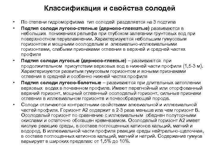Классификация и свойства солодей • По степени гидроморфизма тип солодей разделяется на 3 подтипа • Подтип солоди лугово-степные (дерново-глееватые) развиваются в небольших понижениях рельефа при глубоком залегании грунтовых вод при поверхностном перувлажнении. Характеризуются небольшим гумусовым горизонтом и мощными осолоделым и элювиально-иллювиальными горизонтами, слабыми признаками оглеения в верхней и средней частях профиля • Подтип солоди луговые (дерново-глеевые) – развиваются при продолжительном присутствии верховых вод в нижней части профиля (1, 5 -3 м). Характеризуются развитым гумусовым горизонтом и ясными признаками оглеения в средней и особенно нижней частях профиля • Подтип солоди лугово-болотные – развиваются при длительных затоплении верховых водах в почвенном профиле. Имеют перегнойный или оторфованный верхний горизонт, мощный оглеенный осолоделый горизонт, сильные признаки оглеения в иллювиальном горизонте и почвообразующей породе. • Солоди отличаются контрастными свойствами элювиальной и иллювиальной частей профиля. Горизонт А 2 содержит в 2 -3 раза меньше ила чем горизонт В. Осолоделый горизонт по сравнению с иллювиальным обеднен полуторными окислами и остаточно обогащен кремнеземом. Осолоделый горизонт А 2 имеет кислую реакцию среды, в составе поглощенных катионов кальций, магний и водород. В иллювиальной части профиля реакция среды нейтрально-щелочная, в составе поглощенных катионов кальций, магний и натрий. Содержание гумуса варьирует в широких пределах: от 1, 5% до 10%.
