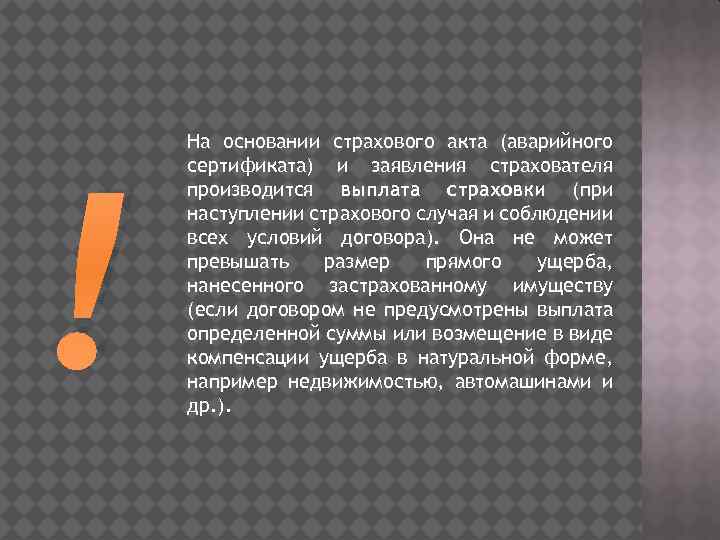 ! На основании страхового акта (аварийного сертификата) и заявления страхователя производится выплата страховки (при наступлении страхового случая и соблюдении всех условий договора). Она не может превышать размер прямого ущерба, нанесенного застрахованному имуществу (если договором не предусмотрены выплата определенной суммы или возмещение в виде компенсации ущерба в натуральной форме, например недвижимостью, автомашинами и др. ).