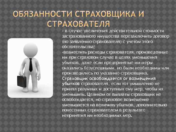 в случае увеличения действительной стоимости застрахованного имущества перезаключить договор (по заявлению страхователя) с учетом этого обстоятельства; возместить расходы страхователя, произведенные им при страховом случае в целях уменьшения убытков, даже если предпринятые им меры оказались безуспешными, но были необходимы или производились по указанию страховщика. Страховщик освобождается от возмещения убытков страхователя, если тот умышленно не принял разумных и доступных ему мер, чтобы их уменьшить. Целиком от выплаты страховщик не освобождается, но страховое возмещение уменьшается на величину убытков, дополнительно понесенных страхователем в результате непринятия им необходимых мер. Страхователь, заключивший договор имущественного страхования, дополнительно обязан сообщить страховщику обо всех заключенных или заключаемых им договорах страхования в отношении конкретного страхового интереса (с тем, чтобы возмещение по конкретному договору не превысило действительной стоимости имущества). принять разумные и доступные меры по предотвращению или уменьшению вреда (поскольку страховщик не должен возмещать убытки, вызванные бездействием страхователя, иначе тот получит сверхвозмещение);