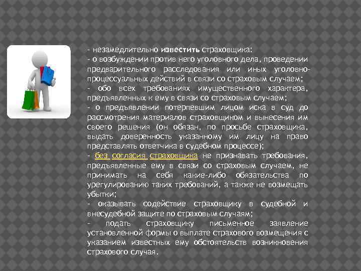 - незамедлительно известить страховщика: - о возбуждении против него уголовного дела, проведении предварительного расследования или иных уголовнопроцессуальных действий в связи со страховым случаем; - обо всех требованиях имущественного характера, предъявленных к ему в связи со страховым случаем; - о предъявлении потерпевшим лицом иска в суд до рассмотрения материалов страховщиком и вынесения им своего решения (он обязан, по просьбе страховщика, выдать доверенность указанному им лицу на право представлять ответчика в судебном процессе); - без согласия страховщика не признавать требования, предъявленные ему в связи со страховым случаем, не принимать на себя какие-либо обязательства по урегулированию таких требований, а также не возмещать убытки; - оказывать содействие страховщику в судебной и внесудебной защите по страховым случаям; подать страховщику письменное заявление установленной формы о выплате страхового возмещения с указанием известных ему обстоятельств возникновения страхового случая.