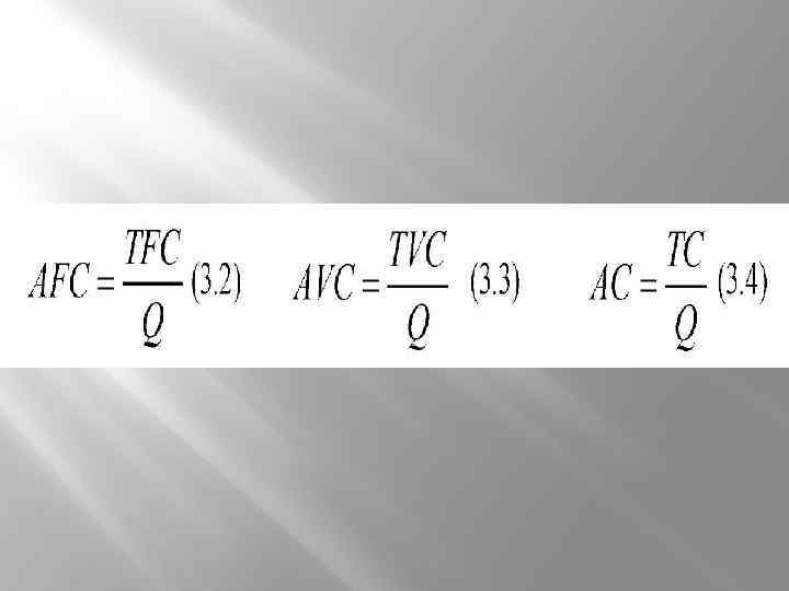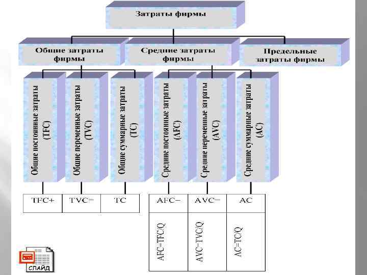 СРЕДНИЕ ЗАТРАТЫ ФИРМЫ Средние (удельные) затраты определяются на единицу масштаба бизнеса Q (на штуку, на комплект). Различают: средние постоянные затраты (AFC), средние переменные затраты (AVC), средние суммарные затраты (AC).