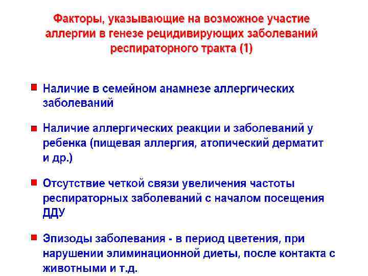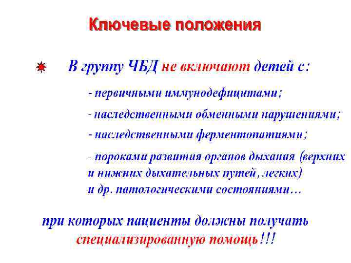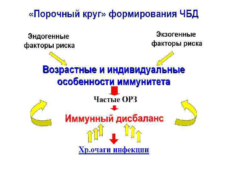 ОСНОВНЫЕ ФАКТОРЫ РИСКА ФОРМИРОВАНИЯ ГРУППЫ ЧДБ: Эндогенные факторы: Неблагоприятное анте- и/или постнатальное развитие Диатезы и другие атопии – проявление генетической предрасположенности к различным патологическим реакциям на обычные раздражители (у 52% ЧДБ) «Поздний старт» созревания иммунной системы (у детей раннего возраста) Экзогенные факторы: Раннее начало посещения детских дошкольных учреждений Частые психоэмоциональные стрессы Очаги хронической инфекции в носо- и ротоглотке (у 63% ЧДБ) Нерациональное использование лекарственных средств (АБ и др. )