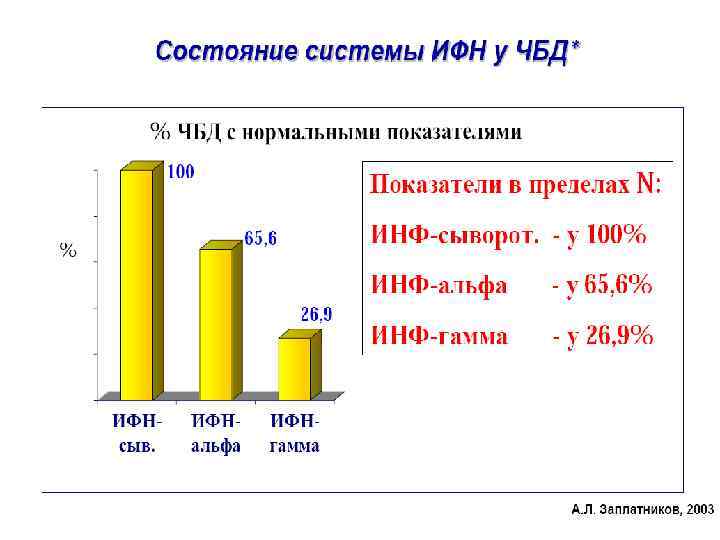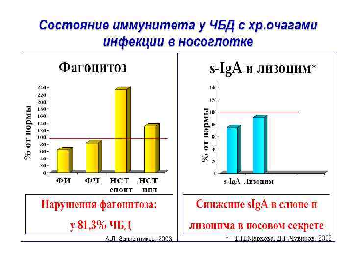 ИММУНОЛОГИЧЕСКАЯ ХАРАКТЕРИСТИКА ДЕТЕЙ ИЗ ГРУППЫ ЧБД: 1. Нарушение неспецифических факторов защиты: снижение секреции s. Ig. A, уровня и активности лизоцима снижение фагоцитоза (81, 3% ЧДБ) нарушение синтеза интерферонов: α- (65, 6% ЧДБ) и γ- (26, 9% ЧДБ) интерферонов 2. Нарушение специфических факторов защиты: снижение соотношения Т-хелперов и Т-супрессоров (СД 4/СД 8), уменьшение числа Т-лимфоцитов и повышение В-лимфоцитов Высокий уровень Ig. M при нормальных значениях Ig. G и Ig. A